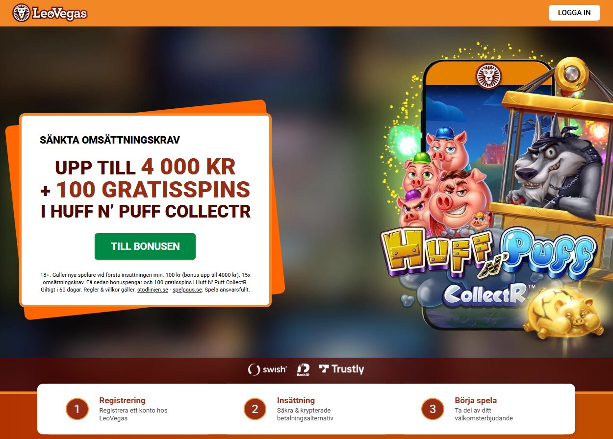 ![]() | LeoVegas | 4000SEK i bonus + 100 spins på Huff n’ Puff Collector | Besök |