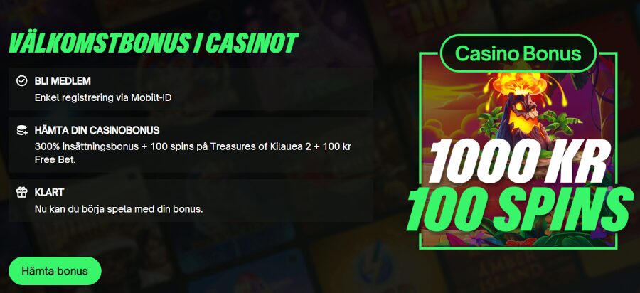 ![]() | Comeon | 300% i bonus upp till 1000 SEK + 100 spins på Treasures of Kilauea 2 + 100 kr Free Bet. | Besök |