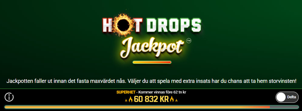 Du kommer nu att satsa 1kr per snurr som bidrar till jackpotten när du spelar utvalda Hot Drops jackpott spel. I lobbyn ser du exakt vilka spel som är utvalda för detta och inne i spelet kan du se jackpott widgeten så att du vet att du spelar Hot Drops jackpott spel.